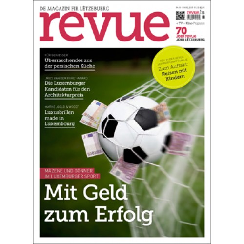 Ohne Sponsoren, Gönner und Mäzene geht in vielen Sportarten nicht viel. revue beschäftigt sich mit den Geldgebern in der Luxemburger Sportwelt. Außerdem stellen wir Ihnen die Luxemburger Nominierten beim Architekturwettbewerb Mies van der Rohe Award und das Luxemburger Luxusbrillen-Label „Gold & Wood“ vor und nehmen Sie mit auf eine Entdeckungsreise in die persische Küche. In der neuen Rubrik „Familie“ beschäftigt sich revue zum Auftakt mit dem Thema „Reisen mit Kindern“. Wie jede Woche gibt es selbstverständlich auch das Neueste aus TV und Kino.