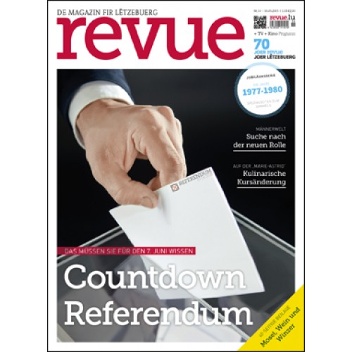Es sind noch vier Wochen bis zum Stichtag des Referendums. Revue beschäftigt sich mit den drei Fragen und ihren gesellschaftlichen Auswirkungen. Lesen Sie außerdem einen Beitrag über den Dokumentarfilm mit Buffalo C. Wayne, eine Reisereportage über Bari und die Region Apulien und entdecken Sie ein Fischgericht von Stefan Dahm, dem neuen Chefkoch der „MS Princesse Marie-Astrid“. In einer 60-seitigen Beilage dreht sich alles um den Luxemburger Wein und wie jede Woche gibt es selbstverständlich auch das Neueste aus TV und Kino.