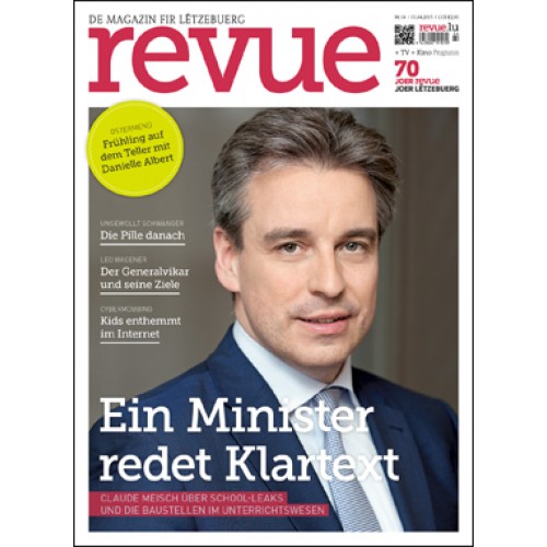 Im revue-Interview bezieht Claude Meisch Stellung zu den aktuellen Affären im Unterrichtswesen. Lesen Sie außerdem einen Hintergrundbericht über die „Pille danach“, ein Interview mit Generalvikar Leo Wagener, ein Porträt des Basketballspielers Thomas Grün und einen Artikel über die Künstlerin Ray Monde. Für Hobbyköche gibt es das revue-Ostermenü von Danielle Albert zu entdecken. Wie jede Woche gibt es selbstverständlich auch das Neueste aus TV und Kino.